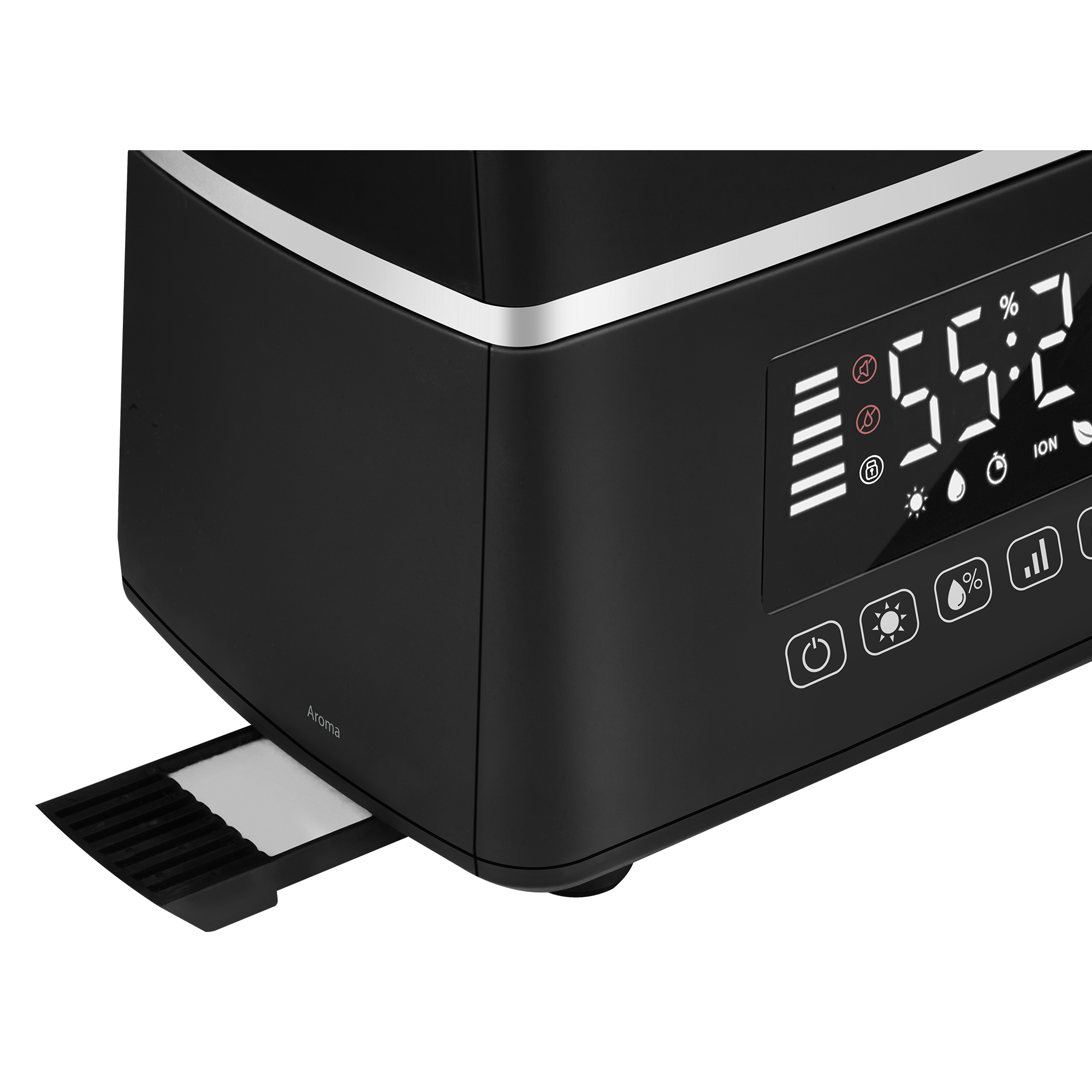 - Яркий, контрастный дисплей в режиме реального времени позволяет отследить текущий уровень влажности, остаток воды в резервуаре, установленные режимы работы