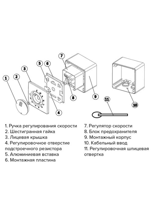 ОписаниеРегуляторы скорости применяются в системах вентиляции для управления скоростью вращения электродвигателей вентиляторов. Скорость регулируется на лицевой части устройства с помощью ручки управления, также она отвечает за включение/выключение. Минимальная скорость вращения задается переменным резистором. С помощью регулятора скорости можно также управлять несколькими вентиляторами. Однако для этого существует одно условие: общий потребляемый ток не должен превышать предельно допустимую величину тока регулятора. Регулятор монтируется на поверхность стены (модель РС-Н) или в стандартные электромонтажные круглые коробки (модель РС-В). Оснащены фильтром высокочастотных помех и плавким предохранителем на 2,5 А (запасной предохранитель входит в комплект). Регуляторы скорости помогают сэкономить электроэнергию, снизить шум от работающего вентилятора, установив его на малые обороты при отсутствии необходимости работы на максимальной скорости, что позволяет продлить срок эксплуатации оборудования в несколько раз.