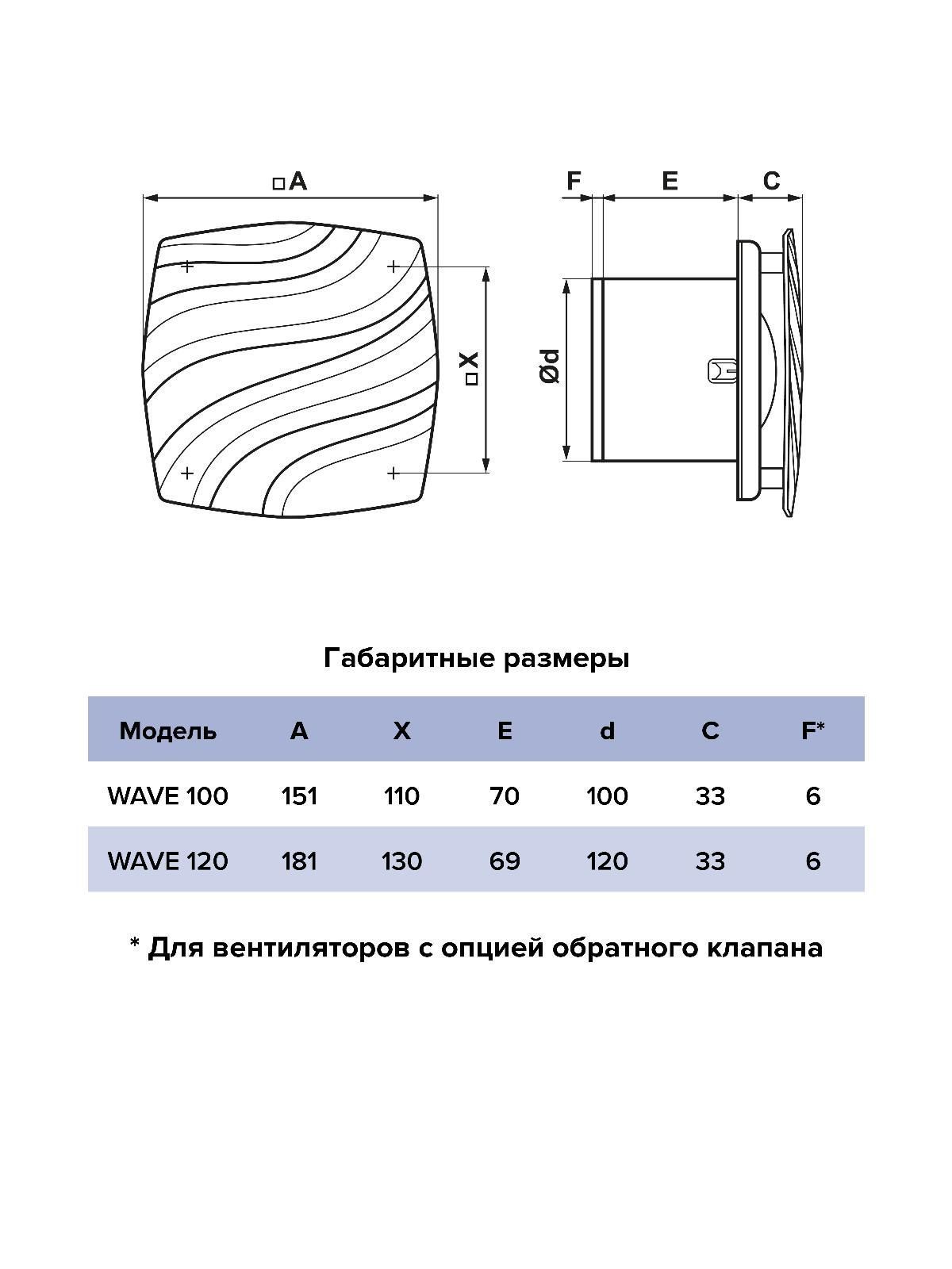 Вентиляторы WAVE оснащены монтажными лапками для простого и надежного крепления; легкосъемной закрытой лицевой панелью и бесшумным обратным клапаном, который предотвращает обратный поток воздуха и проникновение неприятного запаха из шахты.